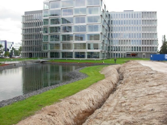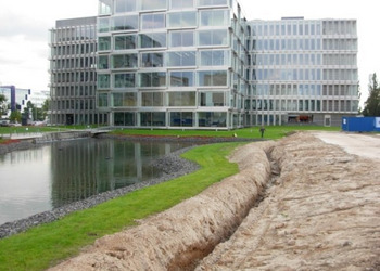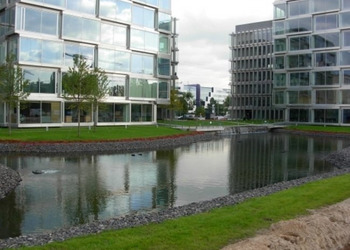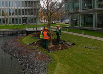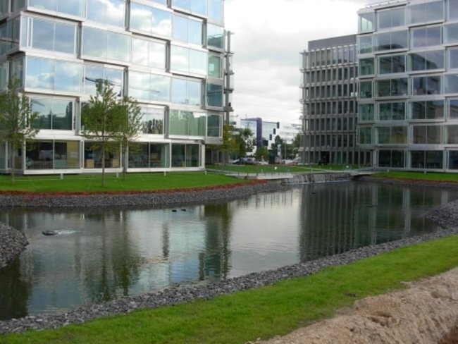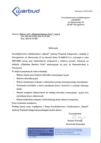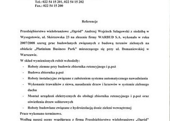 Wykonanie reprezentacyjnej zieleni wewnętrznej i zewnętrznej oraz budowa zbiornika wodnego wraz z systemem automatycznego oczyszczania wody i wykonanie strumieni ozdobnych na obiekcie "Platinium Business Park" przy ul. Domaniewskiej w Warszawie.